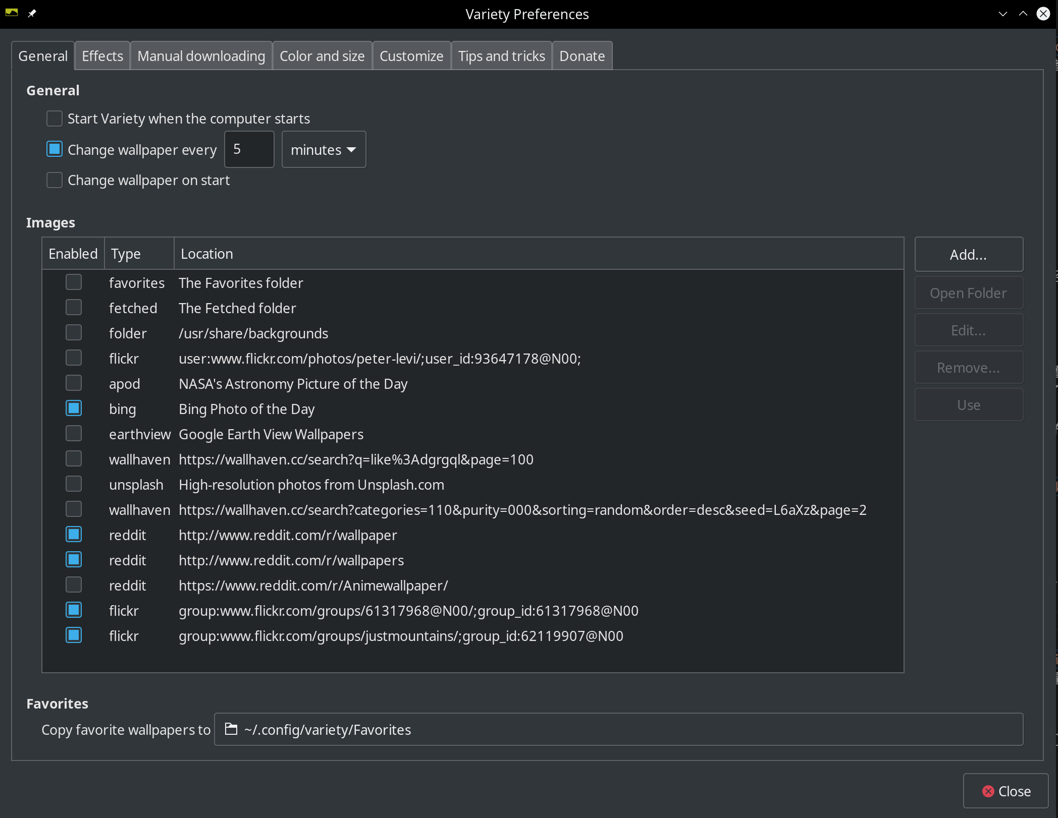 我使用variety 来自动更换壁纸,它可以设置一些源(reddit,flickr,bing)自动获取壁纸。我每5分钟就会自动更换一次壁纸,所以我每次打开桌面看到的壁纸基本都不会重样!